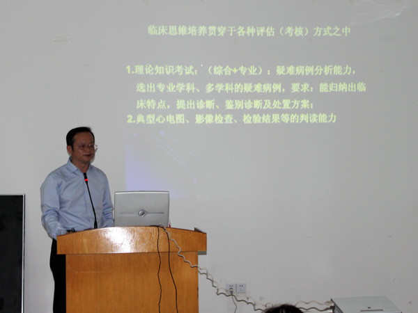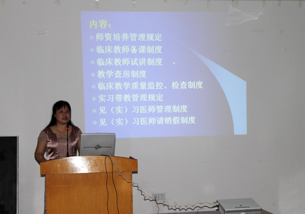 培训会上,临床医学院内科教研室主任曾锦荣、妇产科教研室副主任姚军、教学管理部副主任马维红针对此次培训会的主旨,结合自己的经验,分别讲授了《规范教学查房提高临床实习质量》、《实习带教》、《有关教学规章制度解读》。