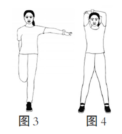 拉伸大腿前侧肌群(如图3):身体直立,双脚与肩同宽。右手抓住右踝,拉向臀部,使大腿前侧有明显抻拉感,保持2个8拍。左手可手扶支撑物。左腿以相同方式拉伸2个8拍。