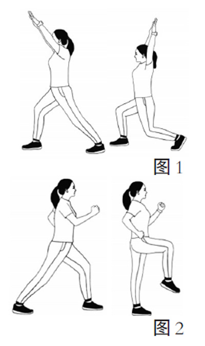 弓步提膝(如图2):双腿呈弓步,双臂呈摆臂姿势。右腿提膝,同时摆臂。做2个8拍,还原。向后转,另一侧同上。