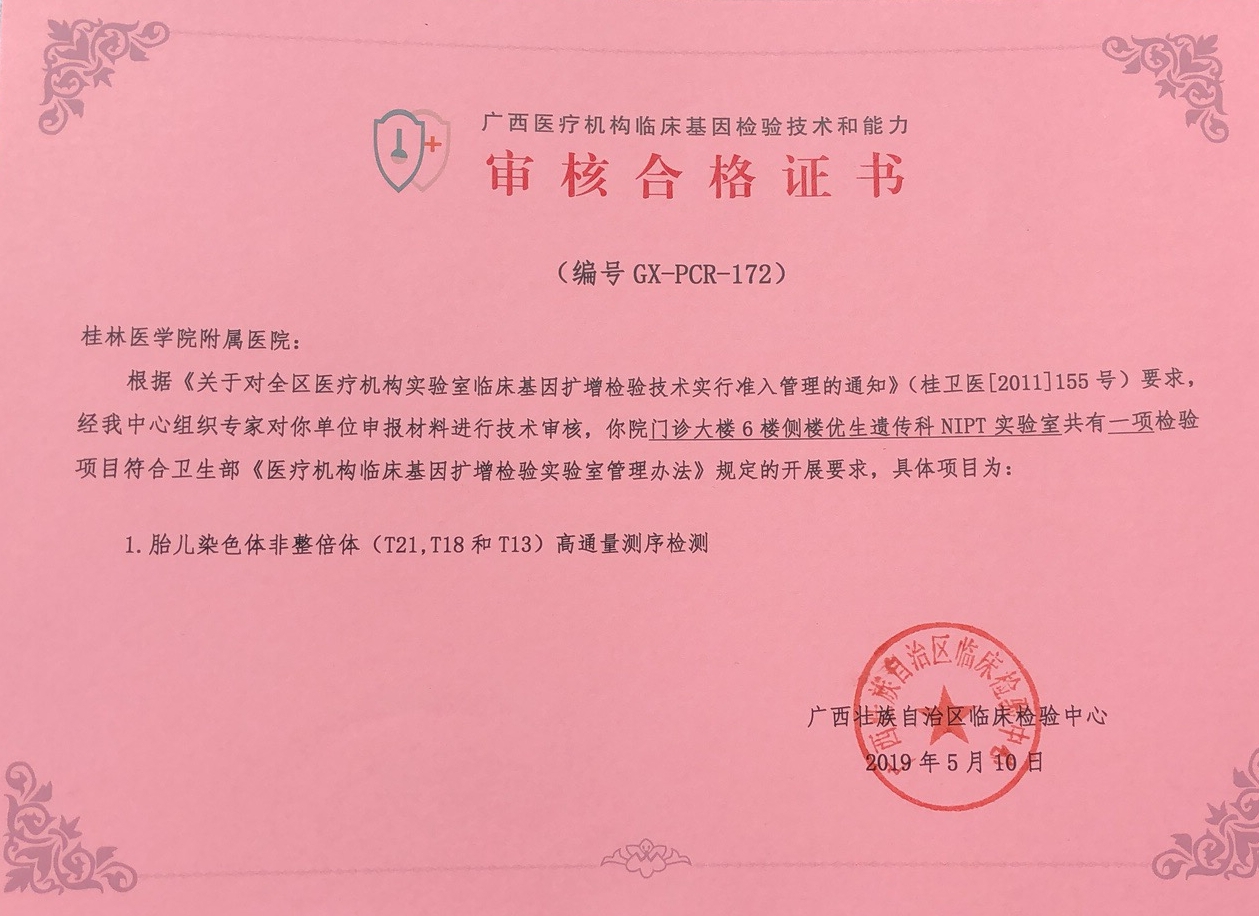 桂医附院于5月10日正式获得由广西壮族自治区临床检验中心发放的“关于开展胎儿染色体非整倍体(T21,T18和T13)高通量测序检测”的合格证书,这意味着桂林医学院附属医院成为桂北地区首家具备开展无创产前检测能力的医疗机构。