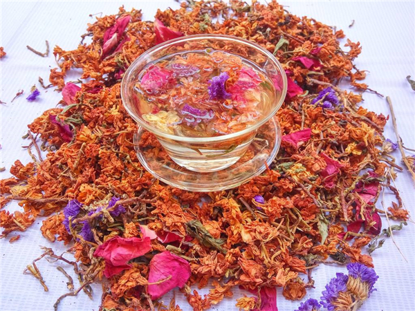 取野菊花、荷花各10克,茉莉花3克,洗净后用开水冲泡,加盖泡10分钟,凉后即可饮用。此茶能起到祛暑气、清凉解热的作用。若是虚寒体质且脾胃虚弱的人最好不要饮用,否则会引起腹泻。