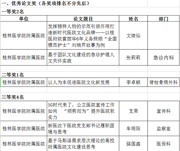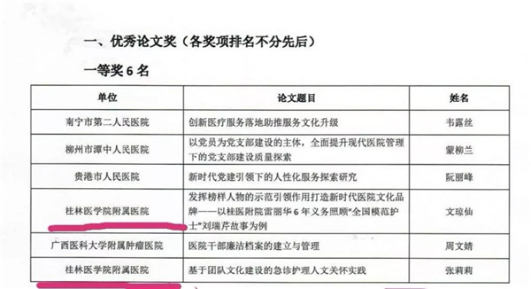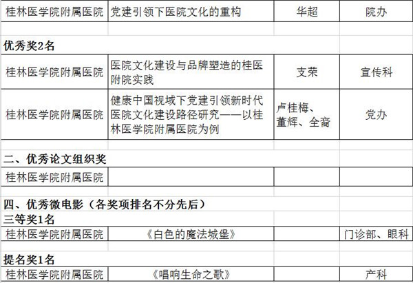 其中,桂林医学院附属医院在优秀论文评选中获一等奖2个、二等奖1个,三等奖4个,优秀奖2个。在优秀微电影评选中,获三等奖1个,提名奖1个。