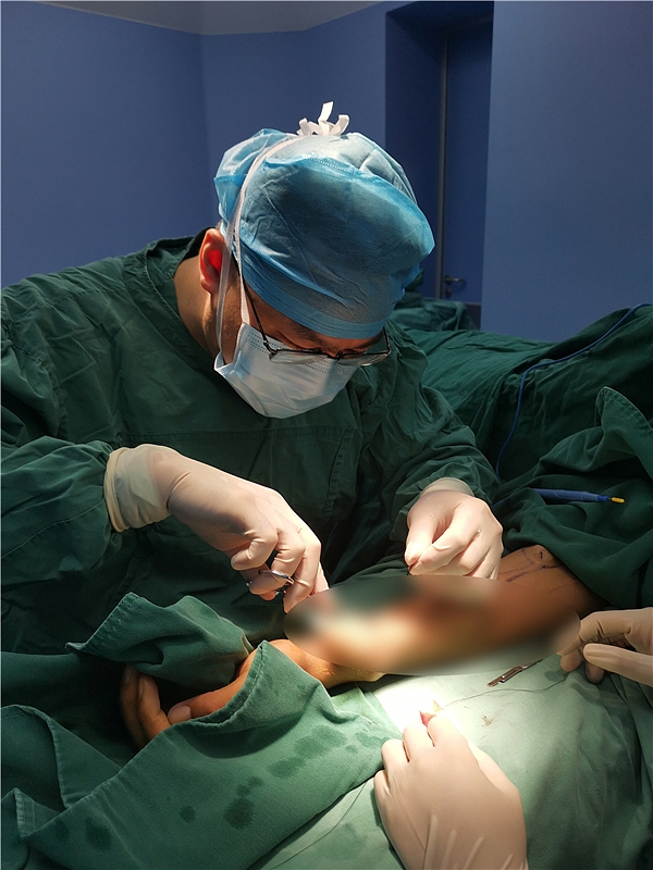 经肾病科医生检查,于先生前臂瘤样扩张明显,瘤体巨大,最大处直径超过5CM,瘤样扩张处总长度约20CM。手术难度非常大,皮肤菲薄,如果分离会随时有破裂大出血风险,而且最大瘤体过于靠近腕关节腕横韧带处,远心端桡动脉阻断困难,需将瘤样扩展段血管切除、多余血管壁缩小缝合成直径为6mm的血管腔后近心端吻合桡动脉,手术时间长,缝合难度大。经肾病科熊有明主任带领的血管通路团队充分研究讨论手术方案及手术中可能出现的风险与应对措施后,由蒋背乐医生主刀成功为患者实施瘤体切除术,并将瘤样扩展段血管切除,多余血管壁修剪成直径6mm血管腔后在近心端吻合桡动脉,使用多余瘤体血管壁补片解除近心端狭窄的血管腔,历经6个小时,手术非常成功。患者术后第二天便可使用该内瘘进行血液透析治疗,血流量充分,于先生非常感动,对手术非常满意。