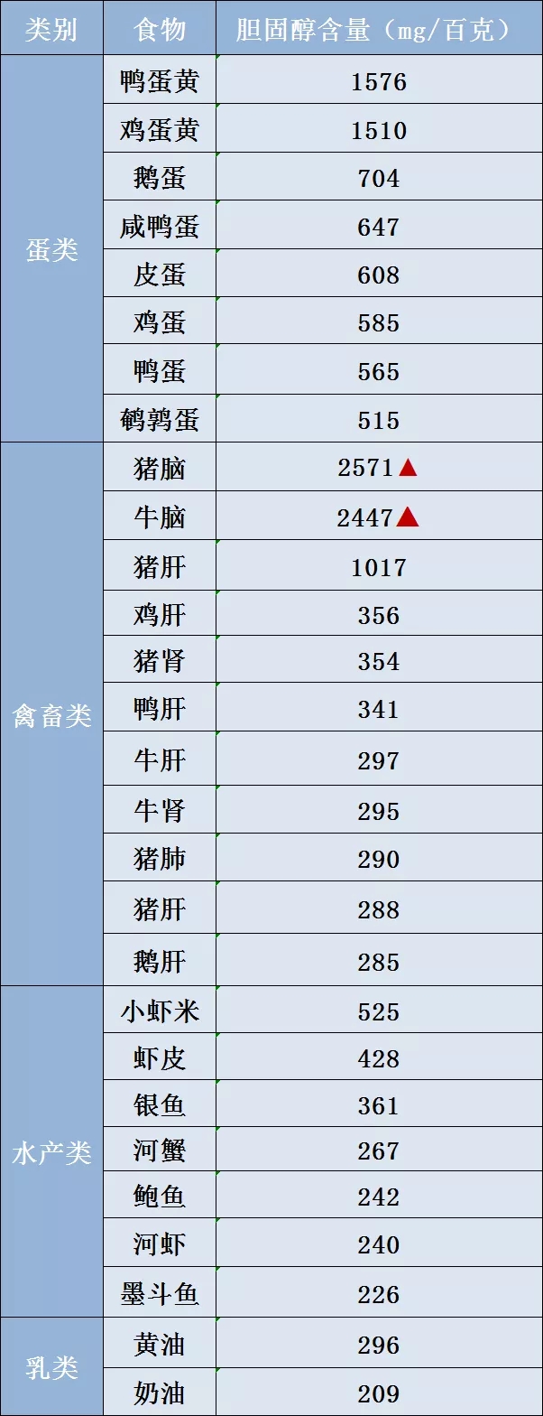 【注意】蛋黄虽然胆固醇含量高,但它同时富含卵磷脂,其能减少肠道对胆固醇的吸收,也能在血液中乳化胆固醇,促进对胆固醇的利用,从而起到调节和控制血胆固醇的作用。因此,相比之下,动物内脏等更值得警惕。