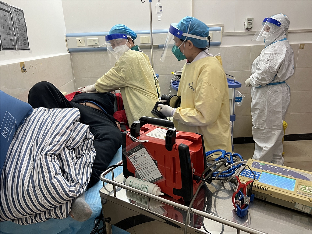 演练过程模拟一中风险地区黄码患者因为发热到院就诊,在特殊发热诊室诊治过程中患者突发胸闷、呼吸困难,医务人员立即将该患者转到抢救室进行抢救,抢救过程中患者血压不断下降,意识模糊,病情危重,需要气管插管,立即予请急诊科医护团队来发热门诊协助抢救,经过感染性疾病科及急诊科所有医务人员分工合作,最终该患者病情转危为安。急诊科兼感染性疾病科主任蒋文钧、急诊科副主任陈丽娟、秦伟丽护士长对整个演练过程进行监督和指导,查找出不足,提出改进意见。在演练总结会上每个参与救治的医务人员均发表了各自感受和心得。