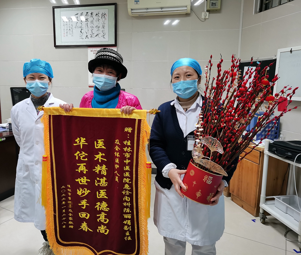 近日,患者李先生的家属将一面印有“医术精湛医德高尚,华佗再世妙手回春”字样的锦旗和红红火火的银柳花盆栽送到桂林市中医医院急诊科医护人员手中,感谢医护人员在危急时刻挽救了李先生的生命。