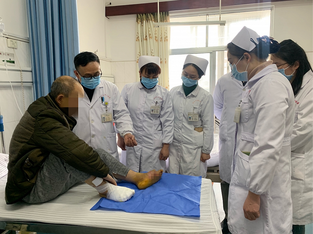 62岁的诸先生糖尿病有3年多,同时伴有糖尿病周围神经病变、周围血管病变,2个月前左足内侧及右足底有一大疱破溃后,自行在家修剪处理,形成溃疡,创面深达肌层,局部创周皮肤发白,创周红肿疼痛,大量分泌物流出,创面污染严重,后到桂林市中医医院内分泌科就诊,当即收治入院,内分泌科给予全身抗感染治疗、中医中药联合持续负压局部清除坏死组织,促进肉芽组织生长,严格控制血糖,经过10余天的精心治疗和护理,诸先生恢复良好,创面已基本愈合,即将康复出院。