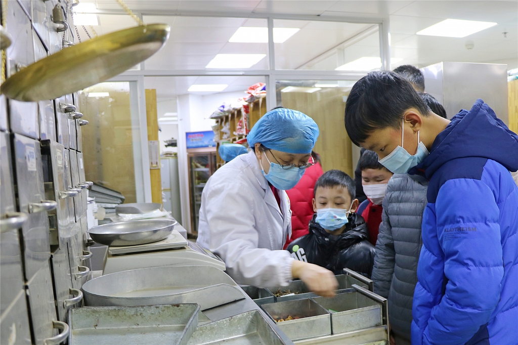 在中药房,中药师带领孩子们识别、品尝几种常见的中药,了解它们不同的形状、大小及功效。孩子们时而去闻闻、摸摸,对于眼前的各种中药材充满了好奇。中药师还带孩子们体验了用小杆秤称药的方法,感受中医药的神奇魅力。