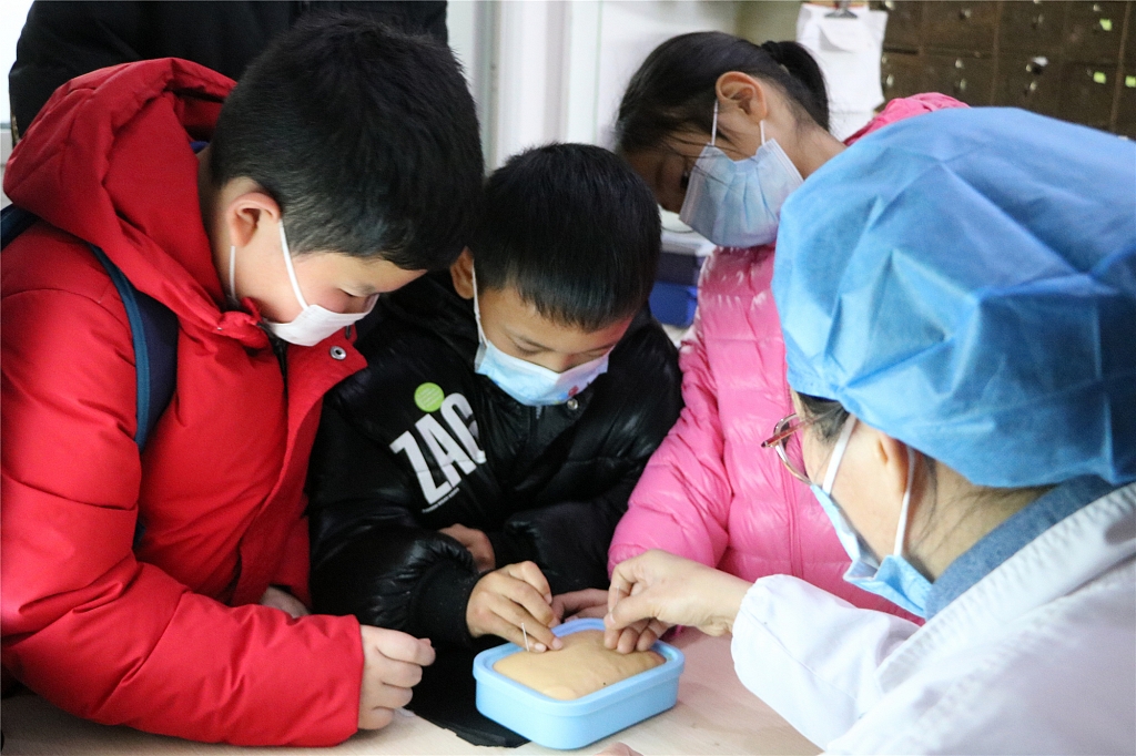 在针灸科,毛曦晔主任系统地介绍了传统中医外治法的发展史和各种治疗方法,并进行了艾灸、火罐、针灸等治疗演示,孩子们纷纷要求体验艾灸、隔姜灸治疗。在简单介绍了中医穴位知识后,毛曦晔主任演示针灸的正确手法,并让孩子们在“仿真皮肤”上实际操作针灸扎针。活动结束后,毛曦晔主任还赠送了中医药科普图书给孩子们,希望孩子们回到家后继续通过阅读图书接受中医药文化熏陶。
