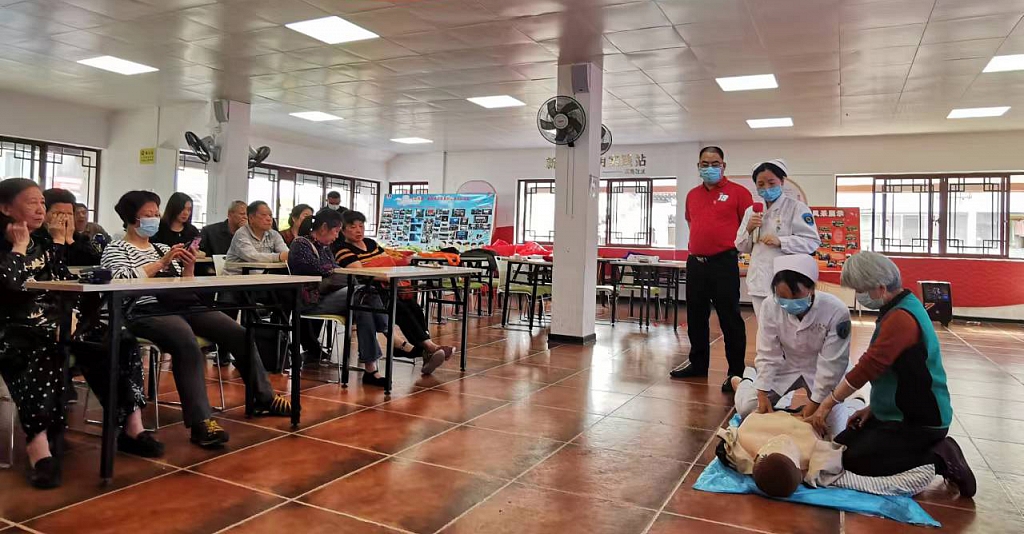 活动中,急诊科专家采取现场讲解和实操相结合的形式为大家普及急救知识。专家结合近年来的急救案例,运用通俗易懂的语言,为居民们边演示边讲解海姆立克急救法,耐心指导教学居民现场体验给模拟人进行心肺复苏。