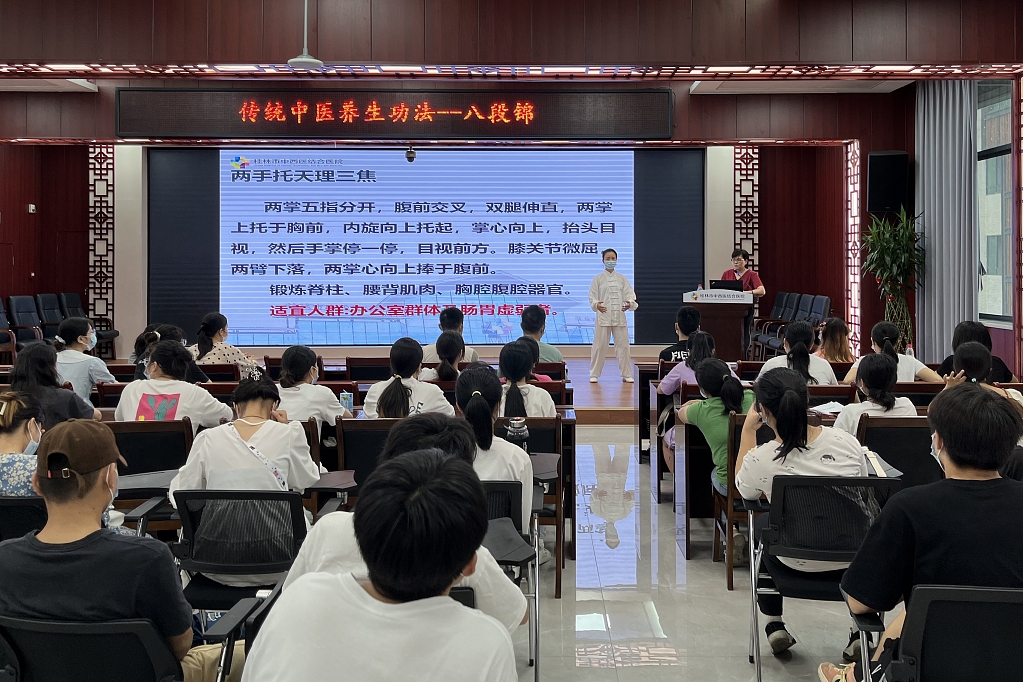八段锦是中华民族流经千年至今仍具有广泛生命力的一项传统养生运动,是祖国传统中医药文化的精粹。炎炎夏日,桂林市中西医结合医院聚集来自4家学校的140多名中医类、健康管理类实习生,开展为期1个月的中国传统功法“八段锦特训营”。