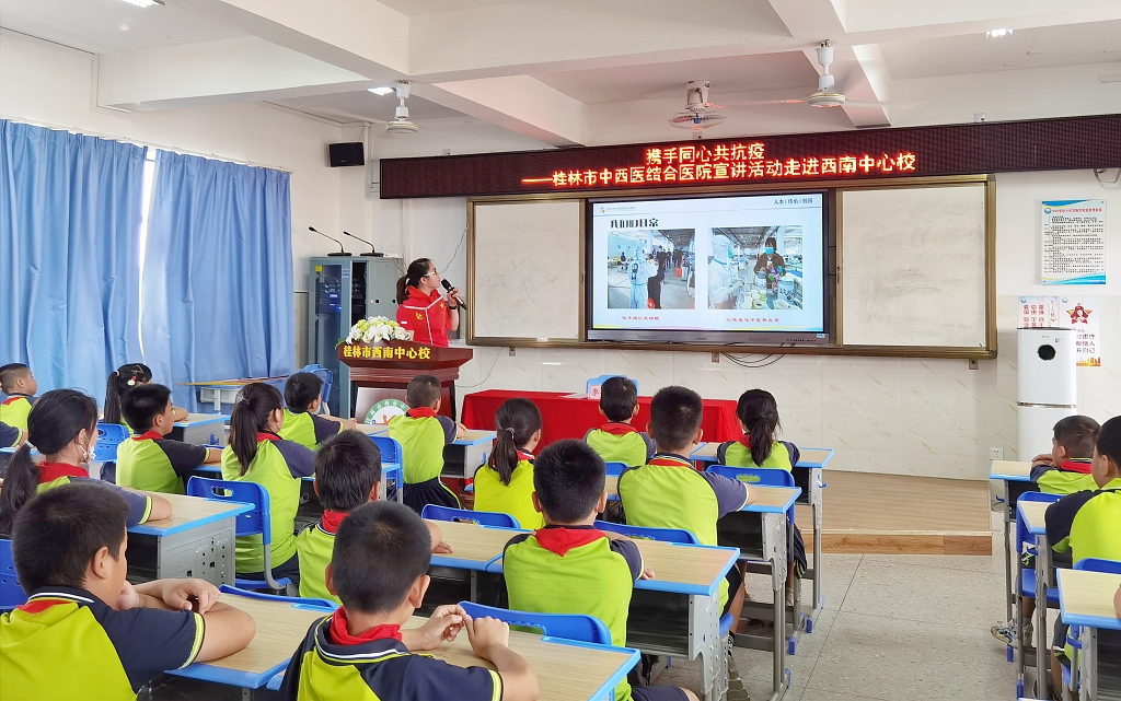 为弘扬抗疫精神,进一步践行社会主义核心价值观,广西援沪医疗队桂林市中西医结合医院队员李年桂应桂林市西南中心校邀请,为同学们讲述抗疫故事,开展“携手同心共抗疫”进校园宣讲活动。
