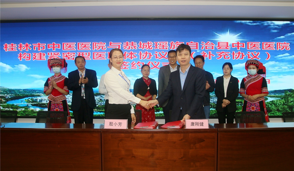 恭城瑶族自治县中医医院党总支部书记殷小芳与桂林市中医医院副院长唐刚健签署合作补充协议