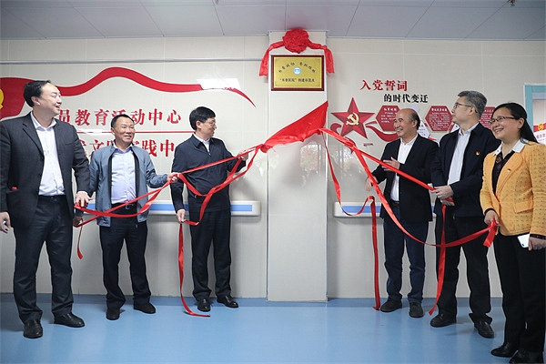 2022年4月23日,桂林市政协副主席钟麟(右3)等领导为南溪山医院“书香医院”创建示范点揭牌。