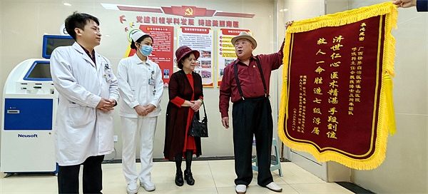 3月22日上午,在桂林市退役军人事务管理局领导的陪同下,桂林86岁老兵何平和家人来到广西壮族自治区南溪山医院呼吸与危重医学科,将一面写有“济世仁心,医术精湛,手段到位,救人一命胜造七级浮屠”的锦旗送到了呼吸科一病区主任佘巍巍博士等医护人员手中,衷心感谢佘巍巍和他的团队在自己病重期间全力抢救,将他从死亡线拉回来的救命之恩。退役军人管理局的有关领导也表达对南溪山医院长期以来坚持开展军民共建、拥军优属,大力支持军队和国防事业的敬意和感谢。