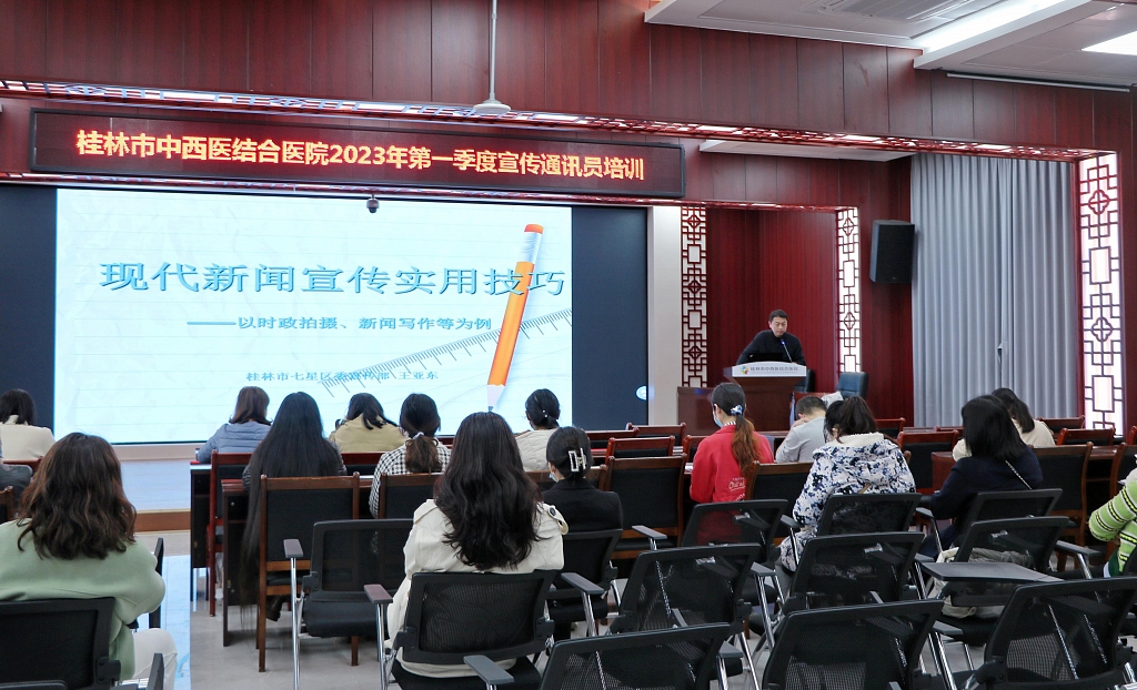 3月31日,桂林市中西医结合医院举办2023年第一季度宣传通讯员培训会,进一步加强医院宣传通讯员队伍建设,有效提升医院宣传工作质量和水平。七星区委宣传部王亚东受邀出席授课,全院50多名宣传通讯员参加培训。