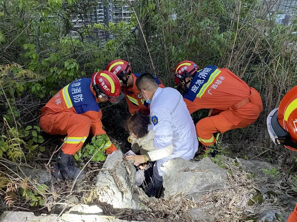 当时女子趴在山顶石头沟里,单侧肢体乏力,言语不清。医护人员立即测量该女子生命指征,完成体格检查后配合消防员将患者转移至山下安全地带。