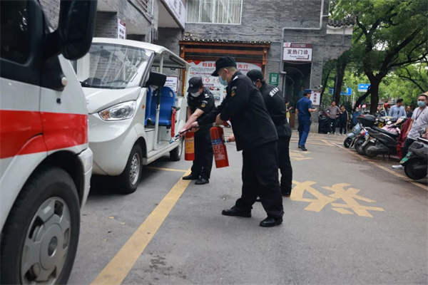 演练设定桂林市妇幼保健院救护车自燃引发火灾,值班保安发现火情后立即用对讲机向医院消防控制室报警,消防控制室接到报警后马上派遣微型消防站队员赶赴现场确认火情,并用灭火器进行初期火灾扑救,同时拨打119报警电话和向医院领导汇报。