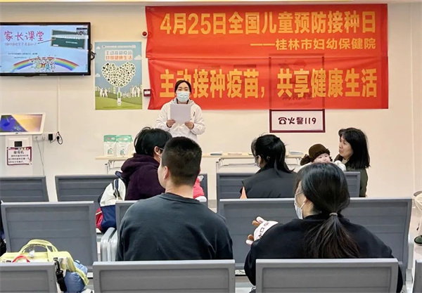 2023年4月25日是我国第37个“全国儿童预防接种日”,为深入贯彻落实新时期以预防为主的卫生与健康工作方针,进一步宣传疫苗接种在控制传染病、保护人民群众生命健康中的重要作用,营造预防接种的良好氛围,倡导全社会重视、关心和支持预防接种工作,根据《国家疾控局综合司关于做好2023年“全国儿童预防接种日”宣传工作的通知》,4月25日上午,桂林市妇幼保健院在儿童健康管理中心开展以“主动接种疫苗,共享健康生活”为主题的宣传活动。