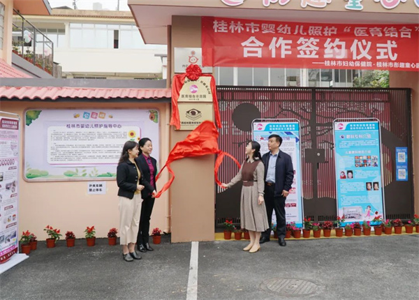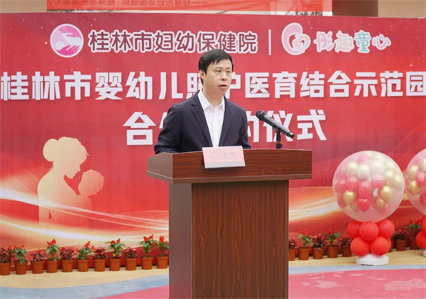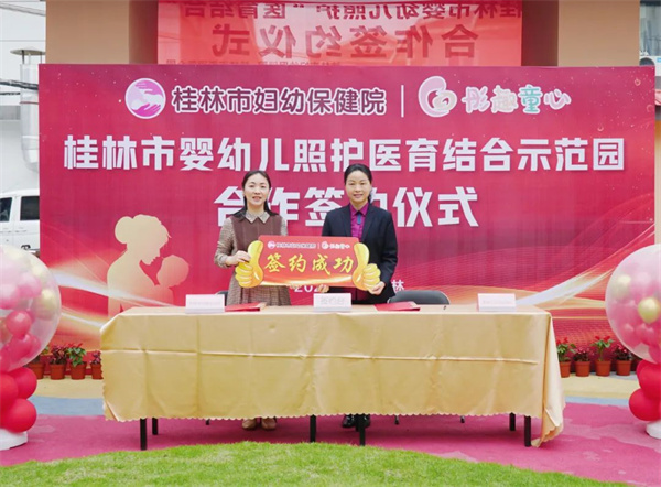 4月27日上午,桂林市婴幼儿照护“医育结合”签约揭牌仪式暨健康促进主题活动在桂林市七星区彤趣童心托育园举行,桂林市妇幼保健院(市婴幼儿照护指导中心)与桂林市彤趣童心托育园达成合作,全面启动桂林市婴幼儿照护“医育结合”工作模式。