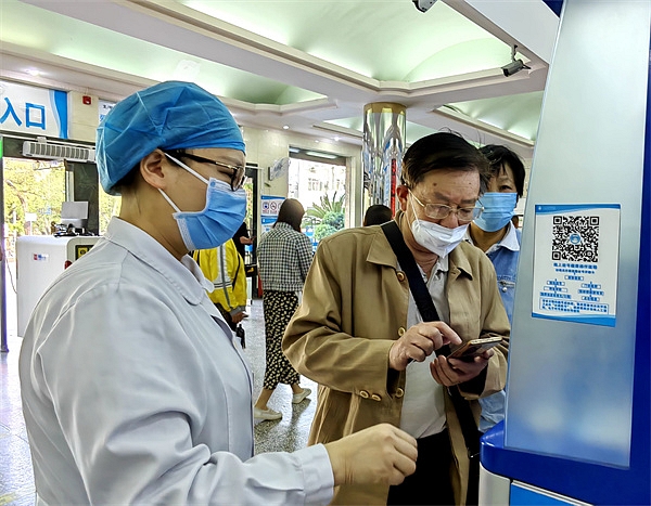 5月1日上午,南溪山医院门诊护士指导患者使用挂号机