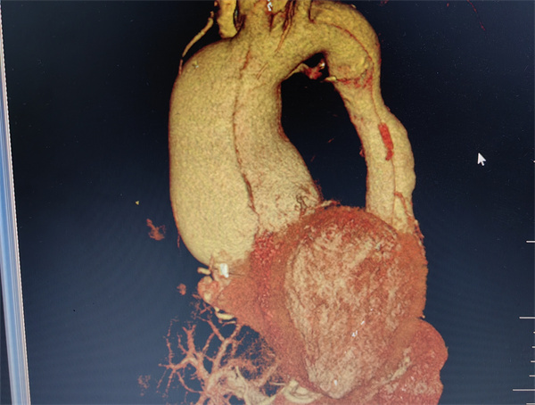 俗语说:“麻绳专挑细处断,噩运只找苦命人”。2023年4月底,李女士开始出现活动后气促、心悸症状,夜间阵发性呼吸困难,只能端坐呼吸,不能平卧睡眠。她自行口服感冒药后症状也迟迟没得到缓解,于是到广西壮族自治区南溪山医院心血管内科住院治疗,却不幸被确诊为A型主动脉夹层及马凡综合征,被紧急转到心脏大血管外科。CT血管造影(CTA)检查提示李女士为A型主动脉夹层(慢性),升主动脉增粗接近10cm,而健康人群的主动脉只有3cm左右;左冠状动脉上方有3cm的巨大主动脉破口,右冠状动脉则是直接内外膜离断,主动脉远端真腔受压极小。