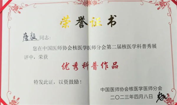 以上科普作品荣获中国医师协会核医学院医师分会第二届核医学科普优秀作品奖。(通讯员 唐毅)