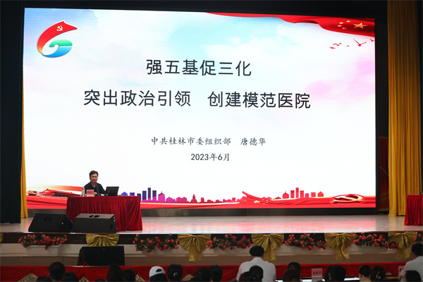桂林市人力资源和社会保障局党组书记、局长,市委组织部副部长(兼)唐德华老师以《强五基促三化,突出政治引领,创建模范医院》为题作专题辅导。他从桂林市的风土人情出发,通过大量的实践案例,向大家生动展示了加强基层党组织建设的重要意义和具体做法,为医院深入开展支部党建品牌建设提供了重要参考。