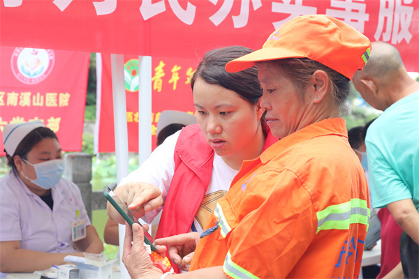 活动现场,南溪山医院团委组织全科医学科和老年病科的医护人员为环卫工人及过往群众提供了免费的健康咨询、血糖和血压检测,并赠送慢性病药品,为群众的健康提供了贴心的医疗服务。此外,中国电信桂林象山分公司的党团员志愿者普及了电信反诈骗知识,并结合案例和数据分析,讲解了新型诈骗套路,有效提高参与者的安全意识和防范能力。