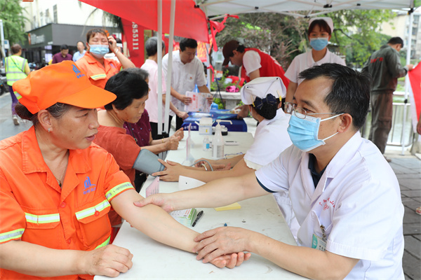 自治区南溪山医院全科医学科主任黄志东正在为环卫工人检查身体