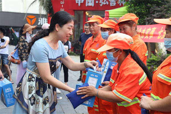 在此次活动中,不少企事业单位和爱心人士为环卫工人和社区老人送上了夏日清凉礼品。来自桂林师范高等专科学校马克思主义学院的王海燕教授向环卫工人赠送了爱心慰问品,以此表达对这些城市“美容师”的敬意和感谢之情。