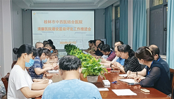 为进一步贯彻落实自治区卫健委关于清廉医院建设星级评定工作,扎实推进医院党风廉政建设和清廉医院建设走深走实,6月19日,桂林市中西医结合医院召开清廉医院建设星级评定工作推进会。医院领导班子、相关职能部门负责人及清廉医院建设工作领导小组办公室成员参加会议。会议由党委副书记、纪委书记蒋富生主持。