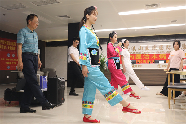 在活动现场,护士们身着刘三姐服饰,融入桂林彩调、数课子等表现形式,通过富有舞台张力和通俗易懂的幽默表达,向参加活动人员传递预防深静脉血栓的专业知识,表演结束后,他们还邀请外国友人一起参与预防深静脉血栓的踝泵运动,现场气氛十分活跃。