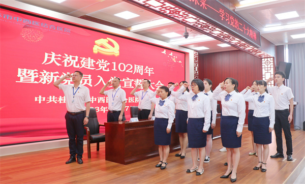 为庆祝中国共产党成立102周年,弘扬伟大建党精神,桂林市中西医结合医院组织开展庆祝建党102周年系列活动,激励全院党员干部坚定理想信念,凝心聚力,团结奋斗,进一步牢记党的光辉历史,发扬党的优良传统,加强党的建设,推动医院高质量发展。