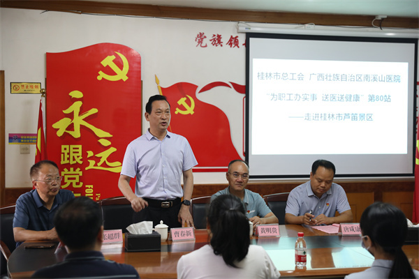 专程前来参与此次活动的桂林市总工会党组成员曹春新表示,南溪山医院和桂林市总工会携手开展的“送医送健康进单位”活动从2021年的8月5日第一站走进桂林市自来水公司开始,到走进桂林市芦笛景区,整整开展了八十站。此活动至目前共为桂林近百个企事业单位的干部职工、群众提供高水平的医疗健康服务超过两万人次,充分展现了南溪山医院作为省级公立医院主动服务社会、服务群众的大爱和担当。今后市总工会要将此项深受职工群众欢迎的活动持续开展下去,让更多职工群众受益,让更多职工、群众感受到工会的温暖,为健康桂林、打造世界级旅游城市助力。