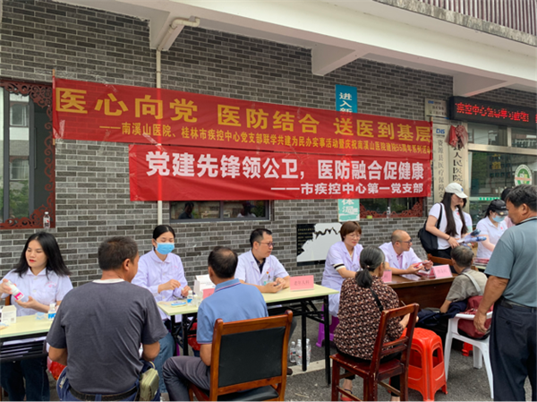 7月7日,南溪山医院内科第九、第五、第一党支部和外科第十三党支部联合桂林市疾控中心第一党支部赴资源县开展主题党日活动,为当地群众义诊,进行防病健康宣教。