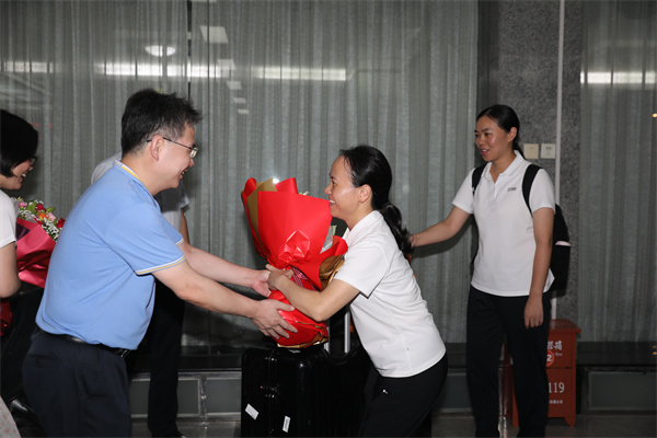 当天夜里10点,南溪山医院党委书记戴前富、副院长柳宏林、医院部分中层干部及该院眼科部分医护人员、医疗队员家属到车站迎接医疗队归来。戴前富与医疗队员们一一握手,并送上准备好的鲜花,庆祝他们平安归来,他对队员们克服环境恶劣、疾病威胁等诸多困难,出色完成援外任务的表现,给予了肯定和高度赞赏。