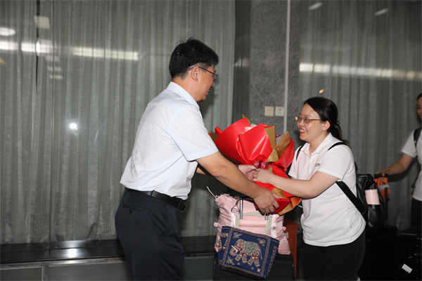 南溪山医院党委书记戴前富向医疗队队长蒋艳华送上鲜花