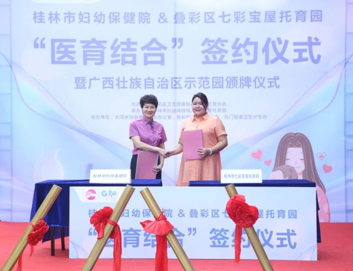 随后,桂林市妇幼保健院副院长马丽与桂林市七彩宝屋托育园园长蒋恒签署合作协议。