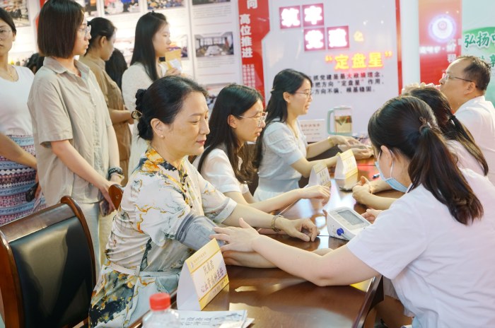 活动现场,医院组织心血管病科、外科、妇科、外治康复部、治未病中心等专家开展中医诊脉、手法诊疗等,就大家关心的健康问题进行答疑解惑,还根据不同人群需求开展了“冬病夏治”三伏贴免费特色疗法体验。结合机关单位工作特点,进行个性化健康指导和日常保健、康复技能指导。中医药文化宣传志愿者还免费发放了医院自制的中药香囊,为前来参加活动的机关工作人员提供中医养生茶品尝,发放中医药文化知识宣传册。现场前来参加活动的机关职工络绎不绝,活动得到了他们的热烈欢迎和一致好评。