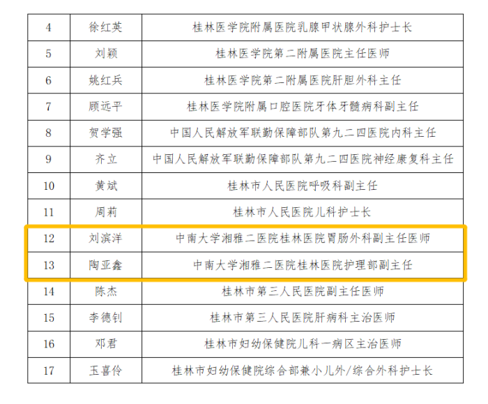 为进一步弘扬广大医务工作者敬佑生命、救死扶伤、甘于奉献、大爱无疆的崇高精神,为表彰先进、鼓舞士气、树立榜样、凝聚力量,进一步激发广大医务工作者拼搏精神和工作干劲,激励医务工作者们积极投身卫生健康事业,桂林市卫生健康委员会对2023年桂林市优秀医务工作者进行表扬。中南大学湘雅二医院桂林医院胃肠、肛肠、血管外科副主任医师刘滨洋,护理部副主任陶亚鑫获此殊荣。
