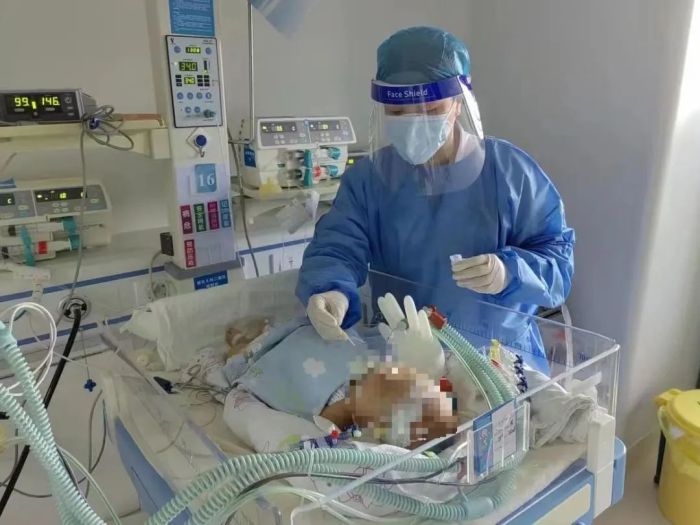 2022年初,新生儿科收治了一名感染新冠病毒肺出血难以控制、反复心跳骤停的8个月大早产儿乐乐,唐瑜主任回忆道:“乐乐病情最危险的时候,肺部X光片表现为‘白肺’,呼吸机参数要求非常高,几近‘爆表’,否则无法维持正常血氧饱和度,肺部一直反复出血,时不时就有血液从气管涌出,稍一动弹,血氧就下降,严重时心率和血氧迅速下降,需要立即吸痰、胸外按压、推肾上腺素等抢救。当时,医护人员大部分感染新冠病毒尚未恢复,人员极为紧缺,科室仍然坚持每班安排医师护士进行“一对一”监护,大家顶住压力,绝不放弃,经过20多个日夜的艰难救治成功挽救了孩子的生命。