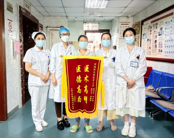 5月15日,桂林市中医医院肾病科患者李先生将印有“医术精湛传四方 医德高尚暖人心”字样的锦旗送到了医护人员手中。患者先生年纪虽才41岁,却已透析十年。2012年患者血肌酐急速增高,肾功能衰竭进入尿毒症期,感觉生活没有了希望,心情非常焦虑、恐惧。肾病科医护人员认真倾听他的心理感受,和他亲切交谈。主动关心他的工作和生活,为患者制定最合适的治疗方案,鼓励患者战胜病魔,恢复健康的信心与决心。他说:“从来没有感受过这种温馨的治疗过程,这里的医护人员是真真切切地为患者着想。”在医护鼓励下,李先生重拾生活信心,做了动静脉内瘘手术,回到当地规律血液透析。现在患者病情变化后,第一时间想到的还是到桂林市中医医院找肾病科主任蒋背乐治疗。再次面对李先生,熟悉患者病情的蒋背乐制订好手术方案并实施,取得了良好的效果,患者非常满意。