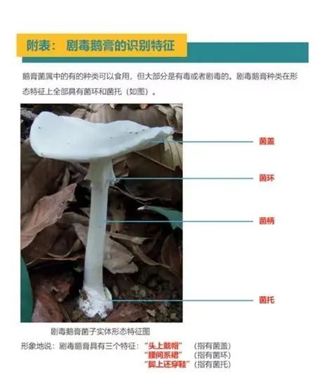 鹅膏类毒蘑菇特征:“头上戴帽(菌盖),腰间系裙(菌环),脚上穿靴(菌托)”!