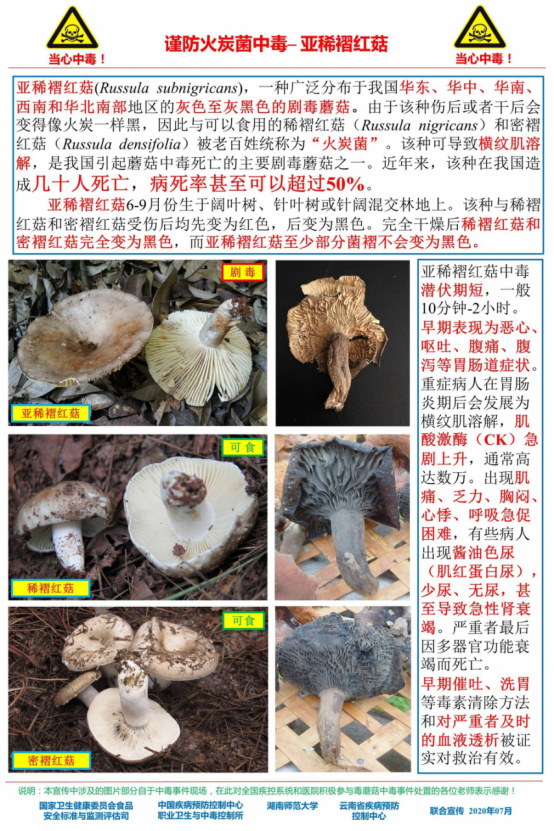 每年的8月,是亚稀褶红菇生长旺盛期,也是中毒高发时节。亚稀褶红菇其貌不扬,典型特征为“灰帽子”(菌盖)、“灰裤子”(菌柄),受伤变红。