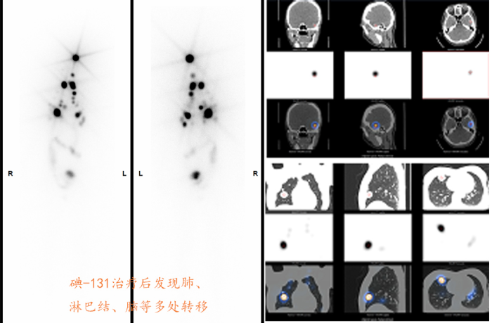(1)对于分化型甲状腺癌的治疗来说,手术+核医学碘131+左甲状腺素钠片是目前国际公认的三大方法,且并驾齐驱。对于甲状腺全切患者,仅以B超、CT评估残留甲状腺往往是难以得到准确信息的(正如前图所看到的)。