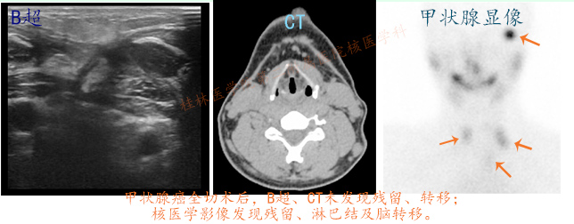 甲状腺癌术后B超未见异常、CT未见异常,核医学可见残留、可见淋巴结转移、可见肺转移、脑转移等