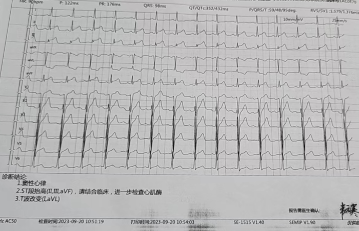 9月20日,一位男性患者在家突发胸闷、胸痛,症状持续不缓解,患者立即至四塘镇卫生院就诊,10:40进入四塘镇卫生院,医护人员10:45完成首次医疗接触,医师接诊患者后快速询问病情,10:51完成首份心电图检查,10:54确诊心电图,明确为急性下壁ST段抬高型心肌梗死,并与临桂区医共体总院桂林医学院第二附属医院胸痛中心联系进行转运PCI(经皮冠状动脉介入治疗)。