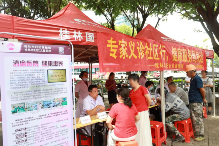 据悉,桂林市妇幼保健院是桂林市两家“清廉医院”建设试点单位之一,活动当天,医院派出了阵容强大的专家团队响应活动主题,为大家现场义诊。团队由副主任医师以上的专家构成,他们来自医院的呼吸与危重症医学科、微创介入(肿瘤)科、耳鼻喉科、儿科二病区、儿童康复科、综合外科、产科以及产后保健科等科室。现场,专家们细心询问居民的身体状况,耐心解答各种疾病问题,引导居民树立健康防护意识,养成健康生活习惯。