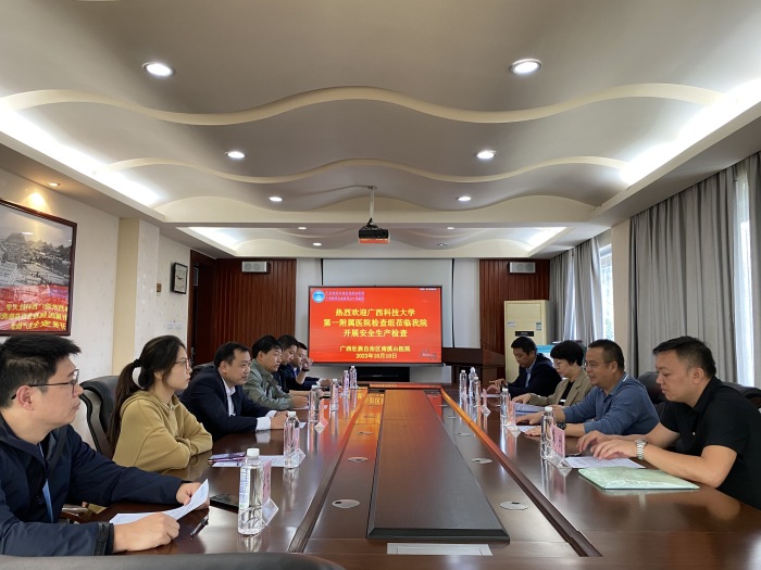 为认真贯彻落实国家关于安全生产重要指示精神,按照自治区卫健委办公室《2023年度全区安全生产和消防安全工作检查方案》工作安排,10月10日,广西科技大学第一附属医院副院长闭雄杰一行4人,到广西壮族自治区南溪山医院开展安全生产和消防安全检查工作。南溪山医院副院长胡长付、医院办公室主任何娟娟、质量管理办公室主任兼投诉管理科科长汤楠、总务科科长张洁、保卫科科长罗宁飞、医务部副主任何黎等相关科室负责人陪同检查。